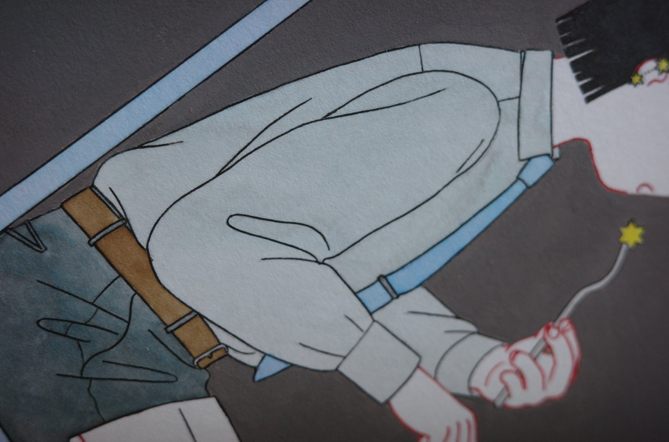 画材: ケント紙に墨、カラーインク、アクリルガッシュ、ペン