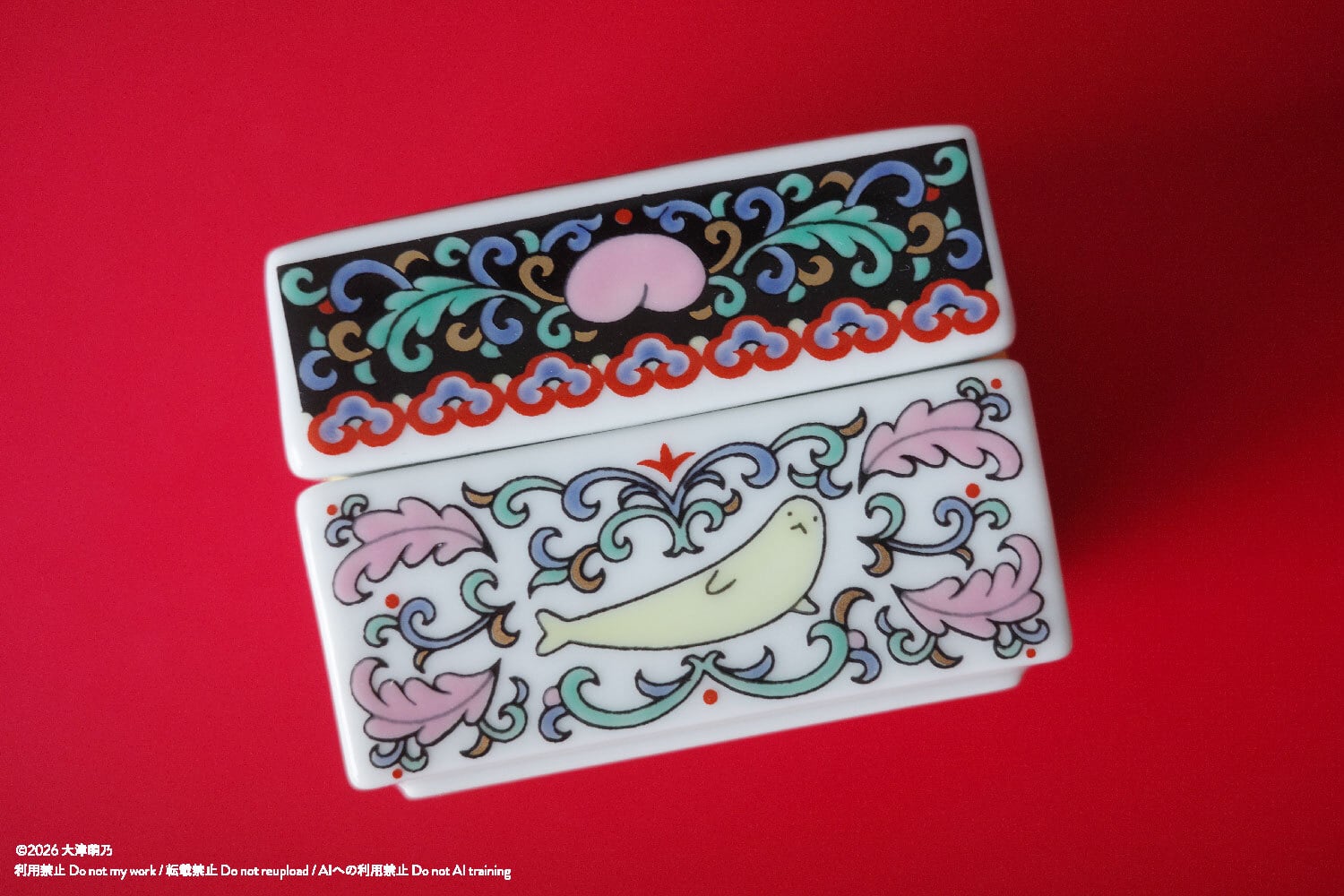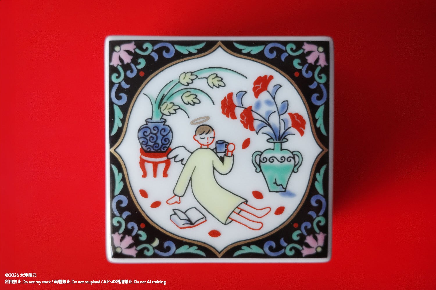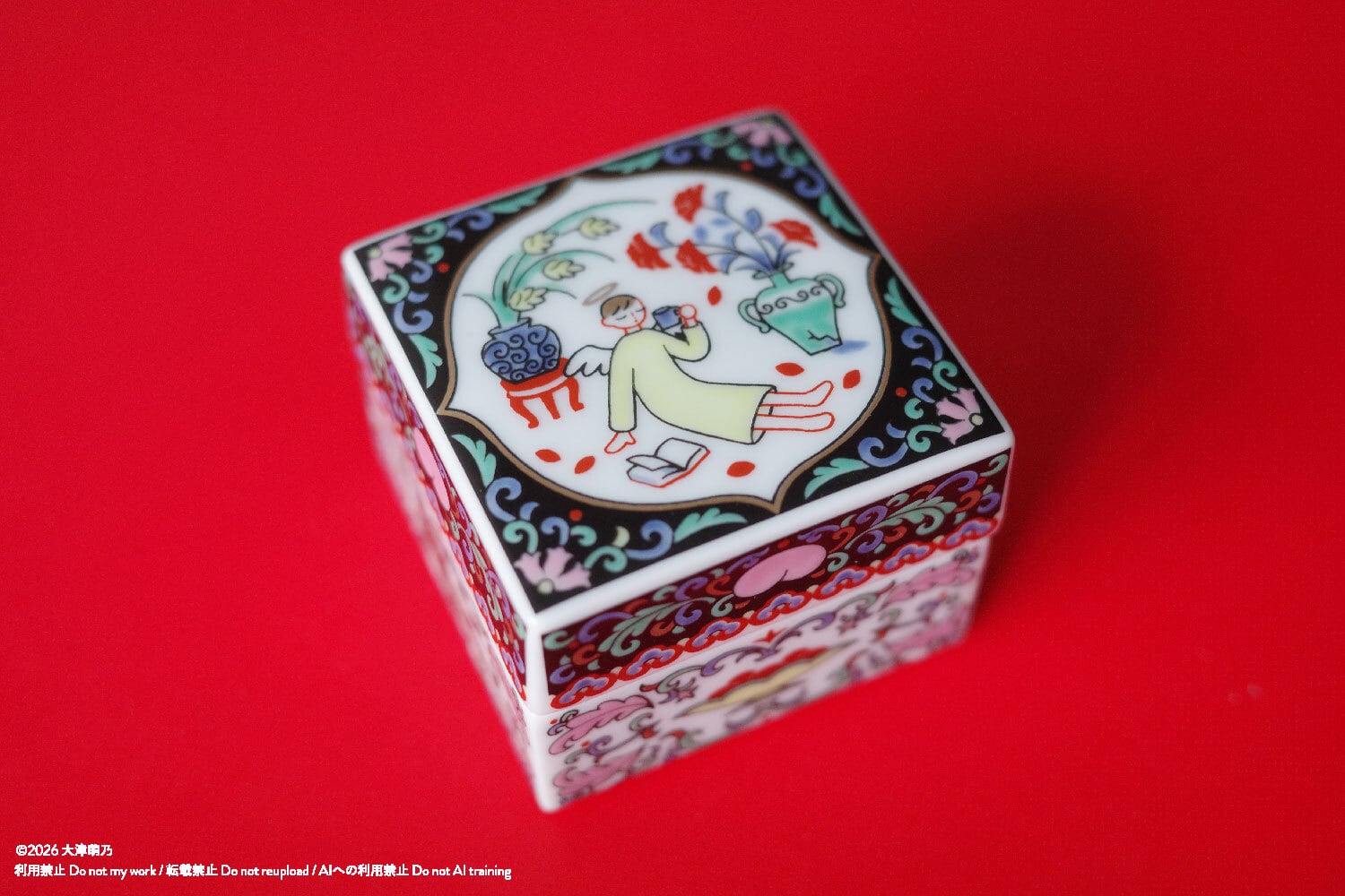 花びらの散った部屋でくつろぐ天使、側面には動物と果物を描きました。