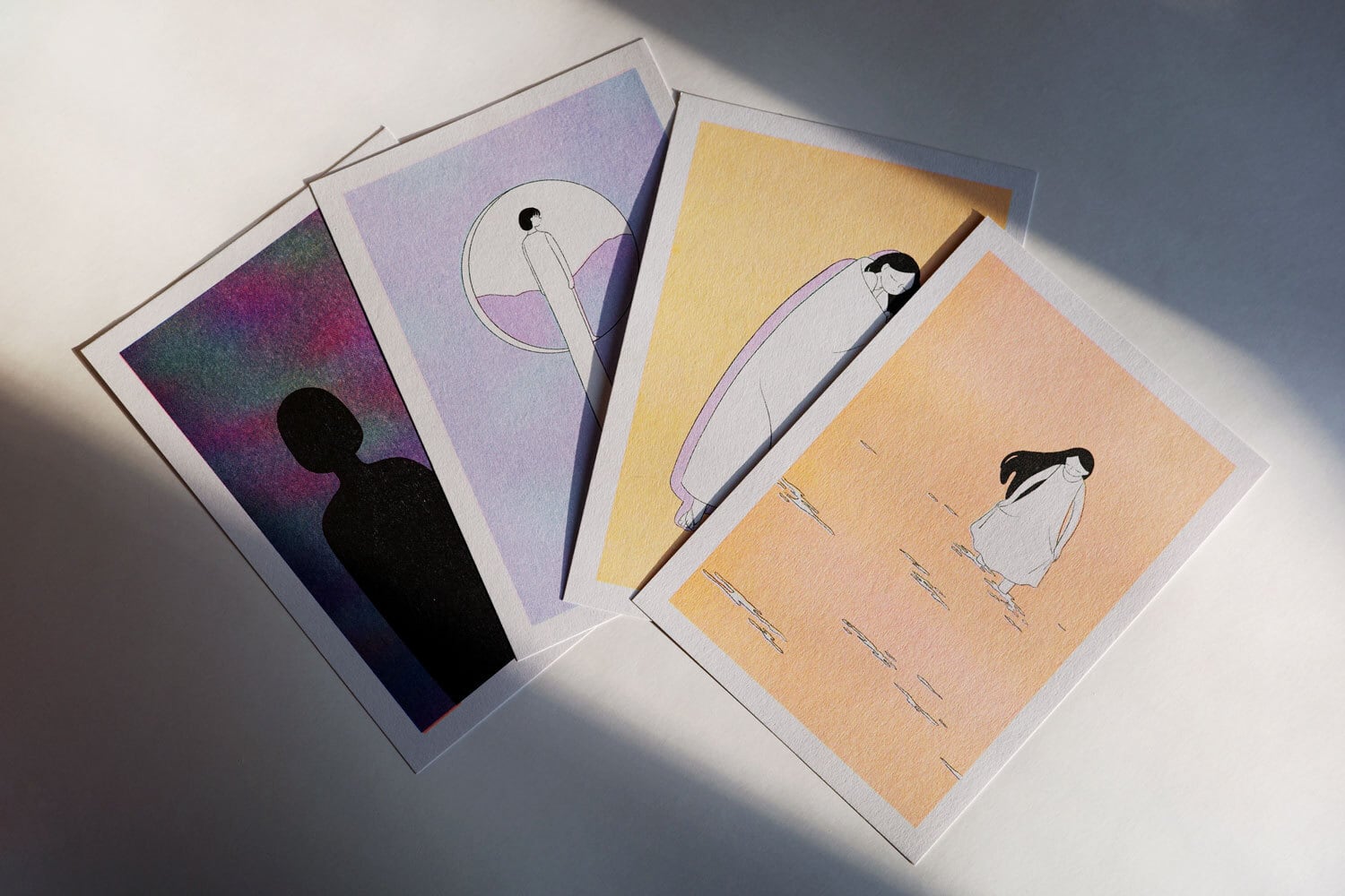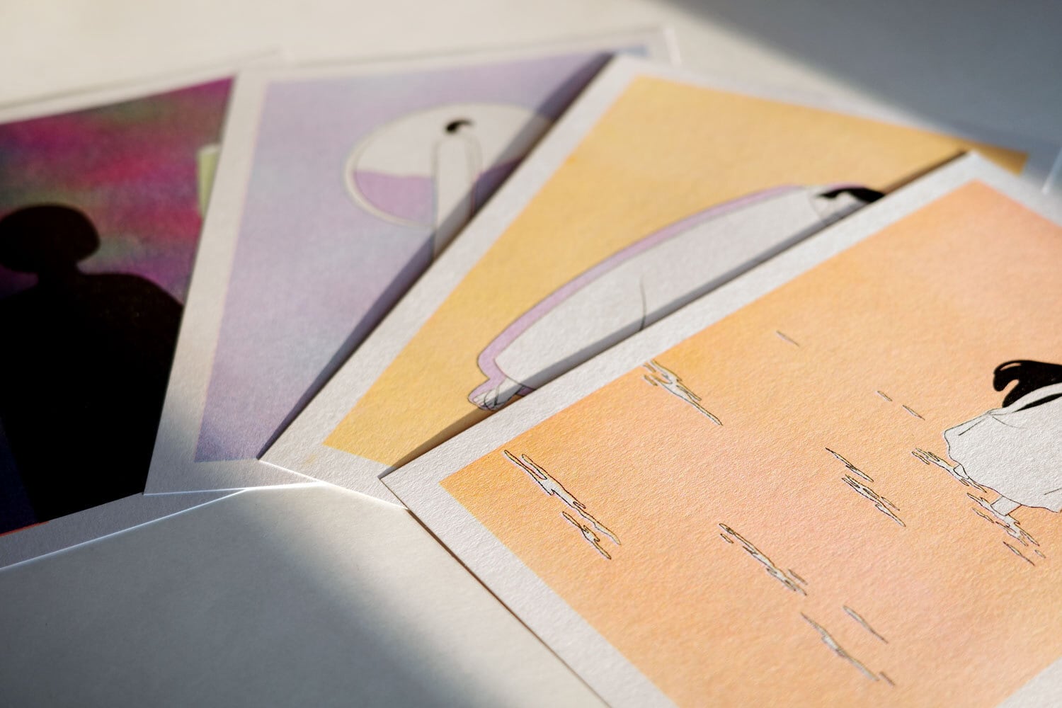 A5サイズのミニポスター4枚組。リソグラフ印刷の淡く繊細な刷りを楽しんでいただける作品です。