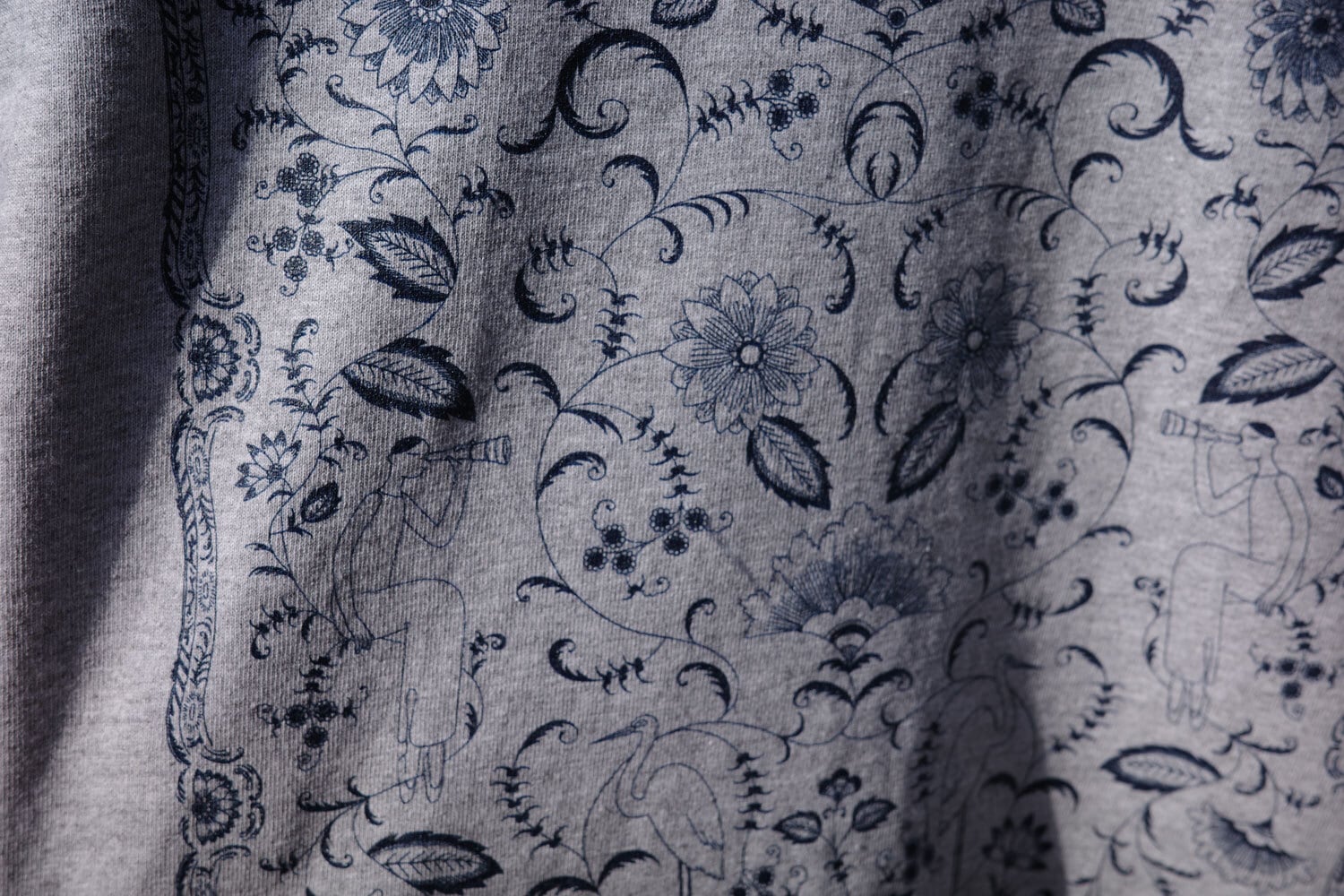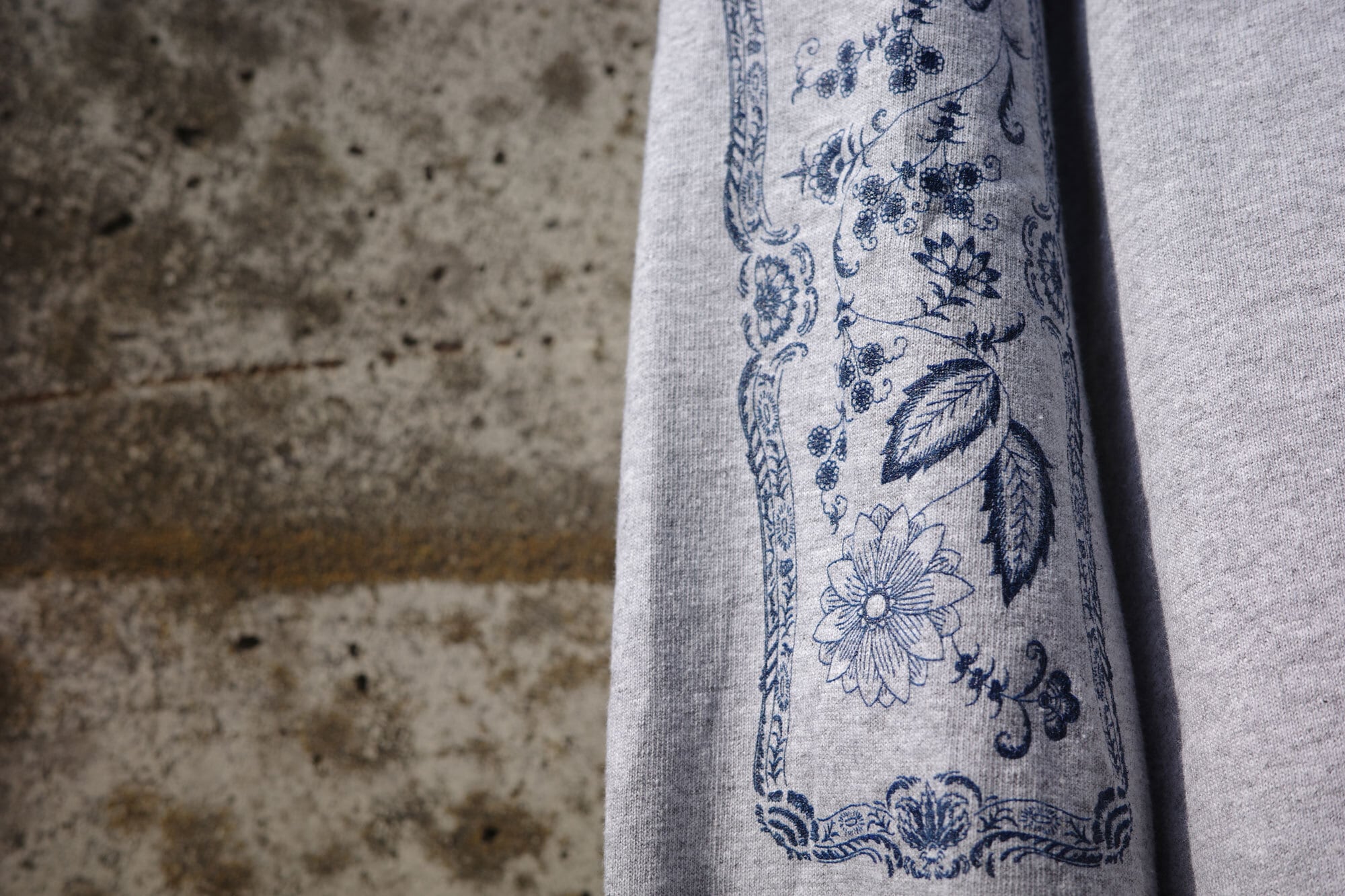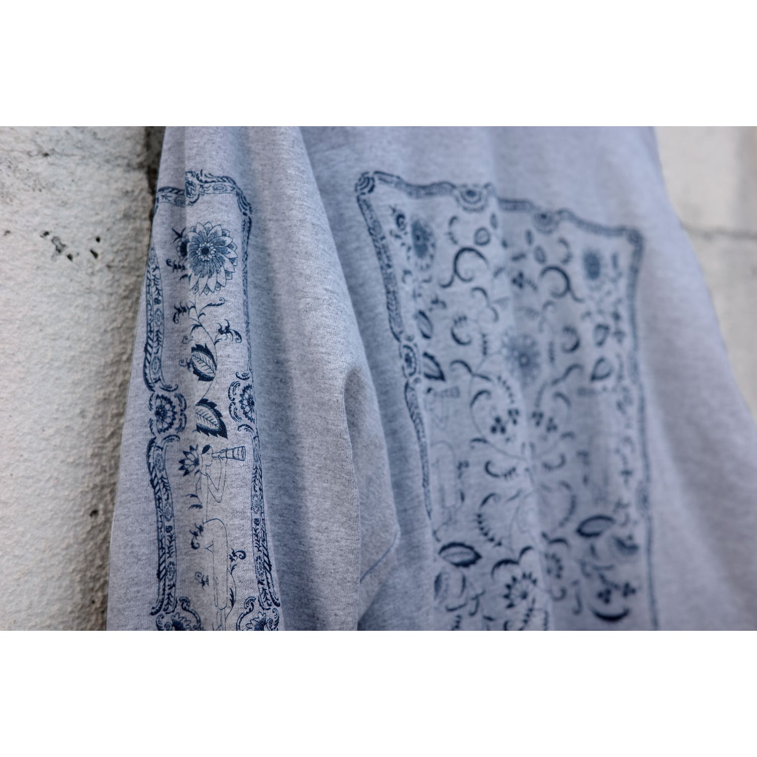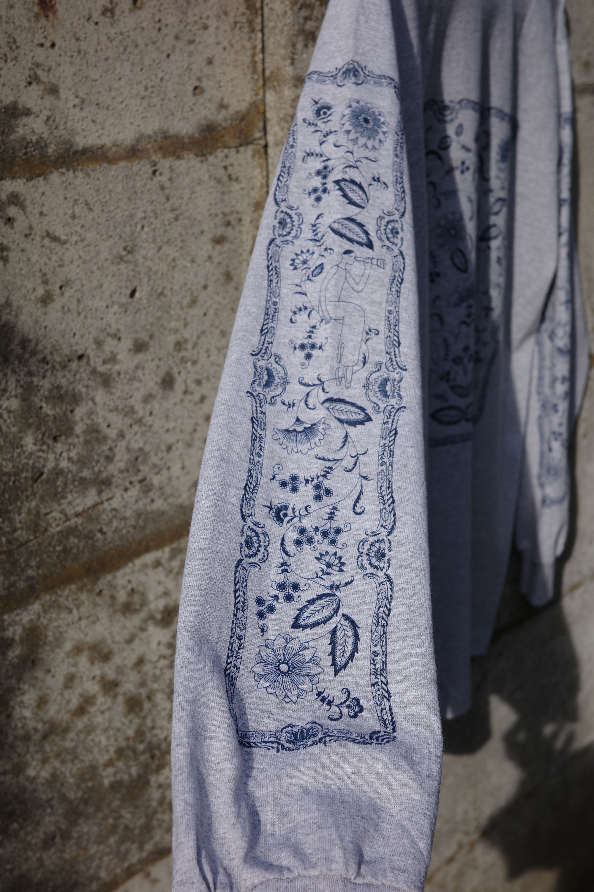 陶器の染付の文様をモチーフにしたロングスリーブTシャツ。生土のようなグレーのボディに深い藍色の絵付をしました。生地は薄めの綿素材です。ユニセックスサイズ。